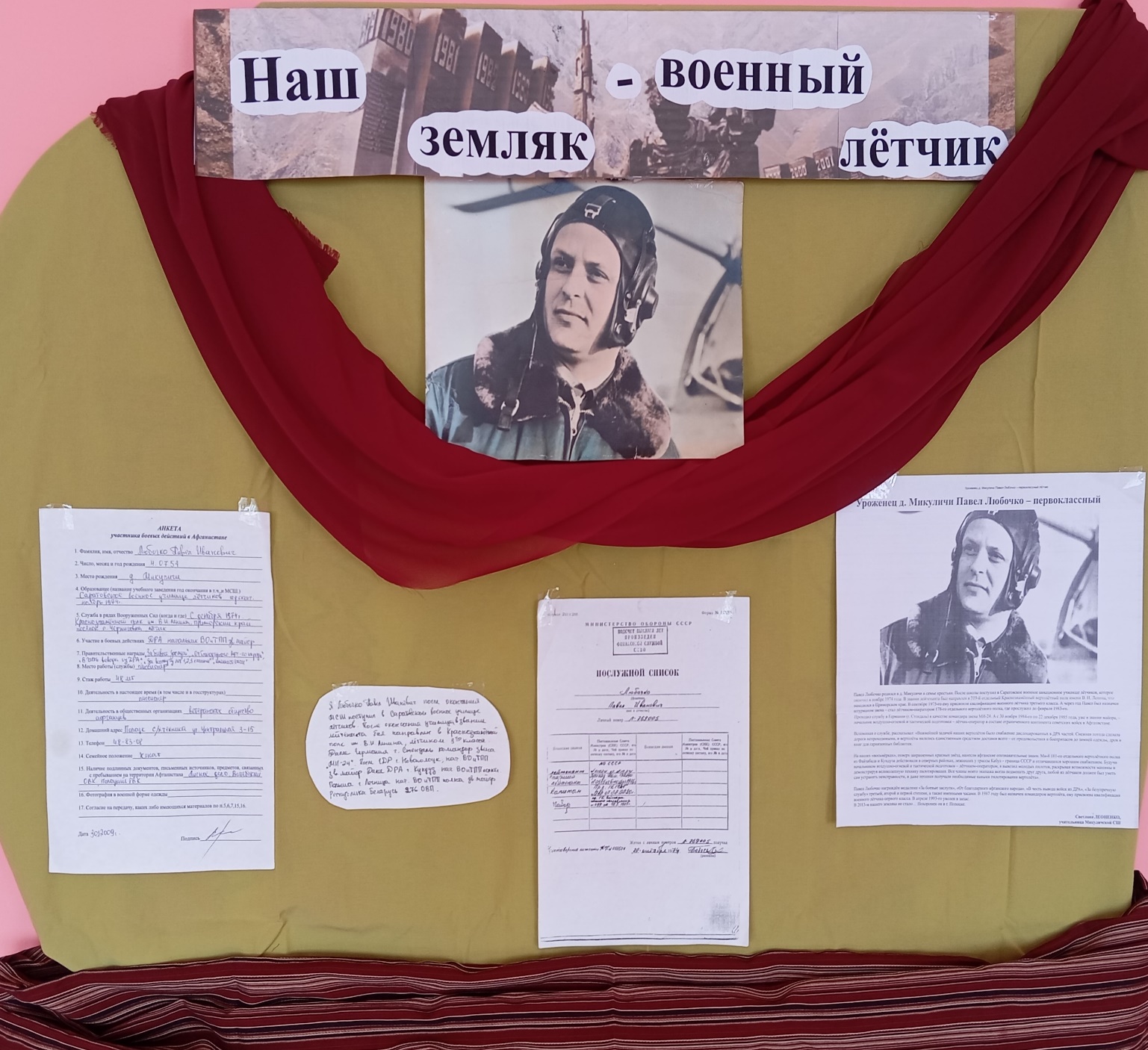 Экспонат посвящён Павлу Ивановичу Любочко - майору, военному лётчику, участнику боевых действий в Афганистане (1984-1985).
