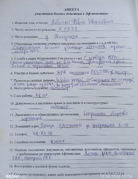 Анкета участника боевых действий в Афганистане