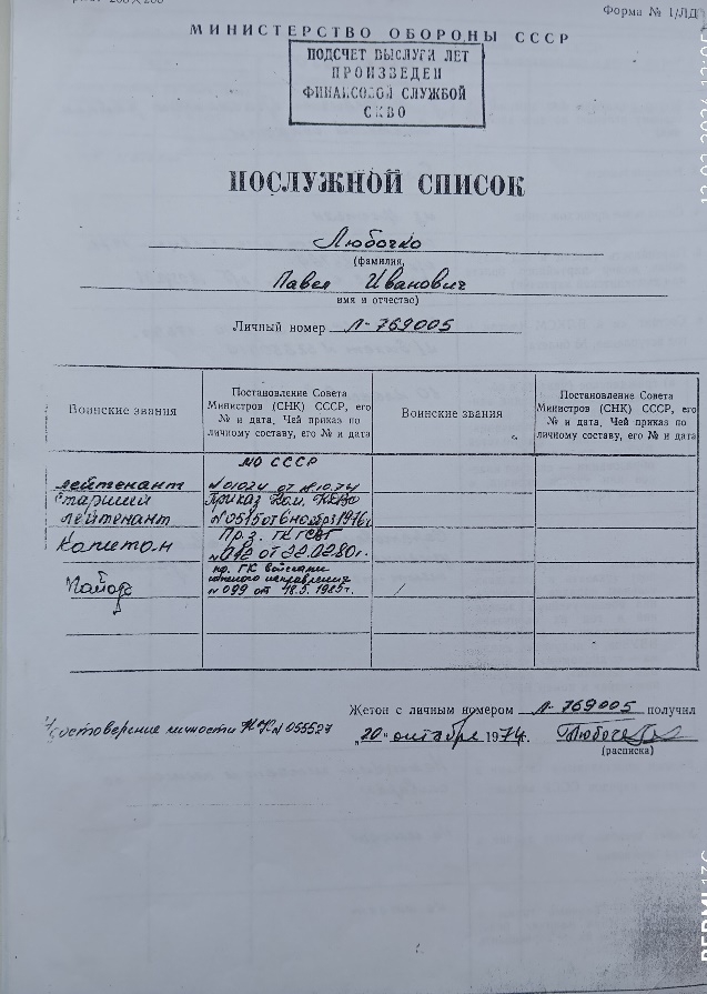 Текстовая панель: краткая биография П. И. Любочко, хронология службы,